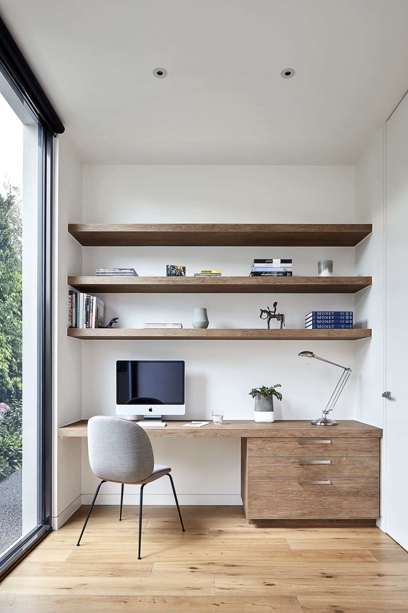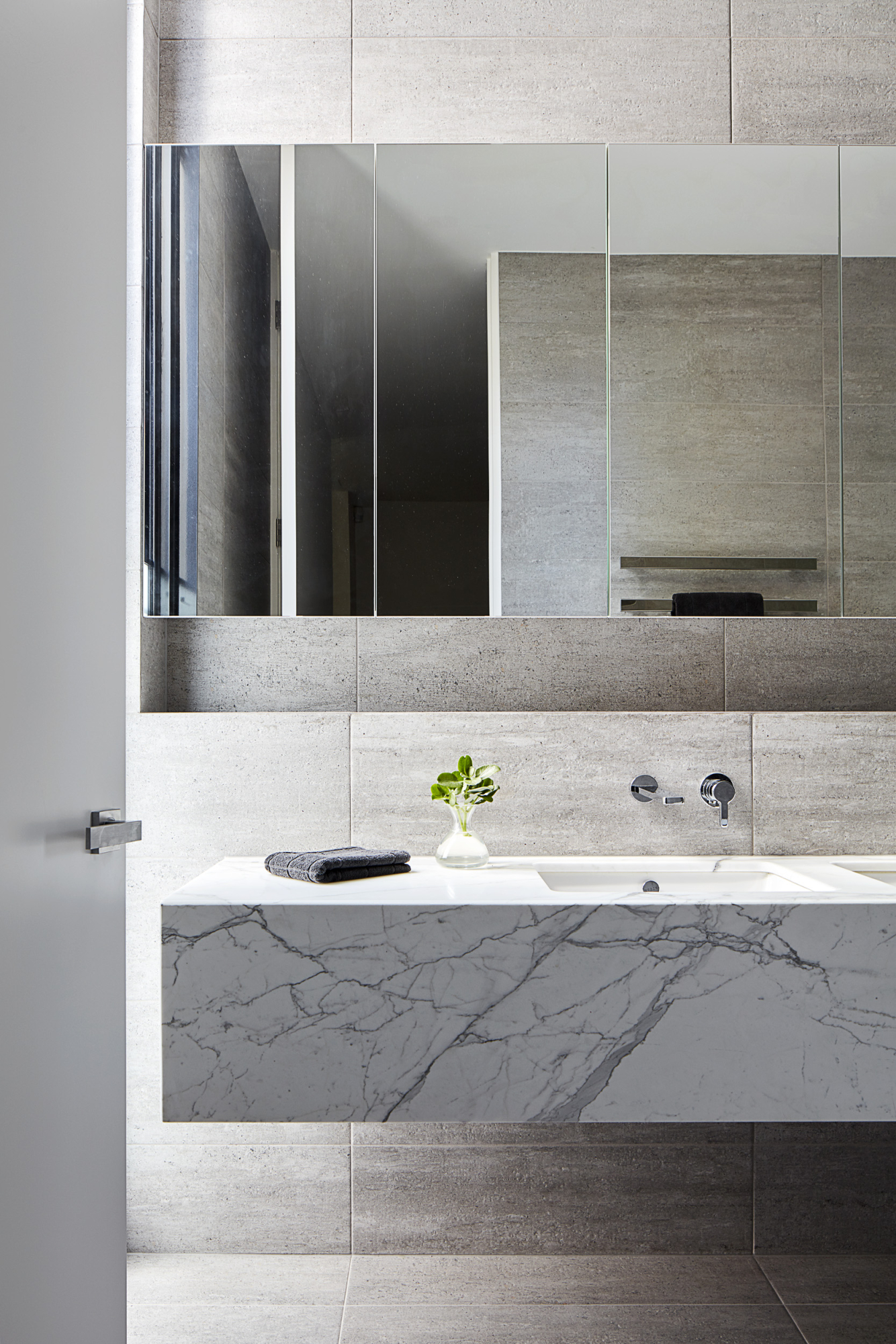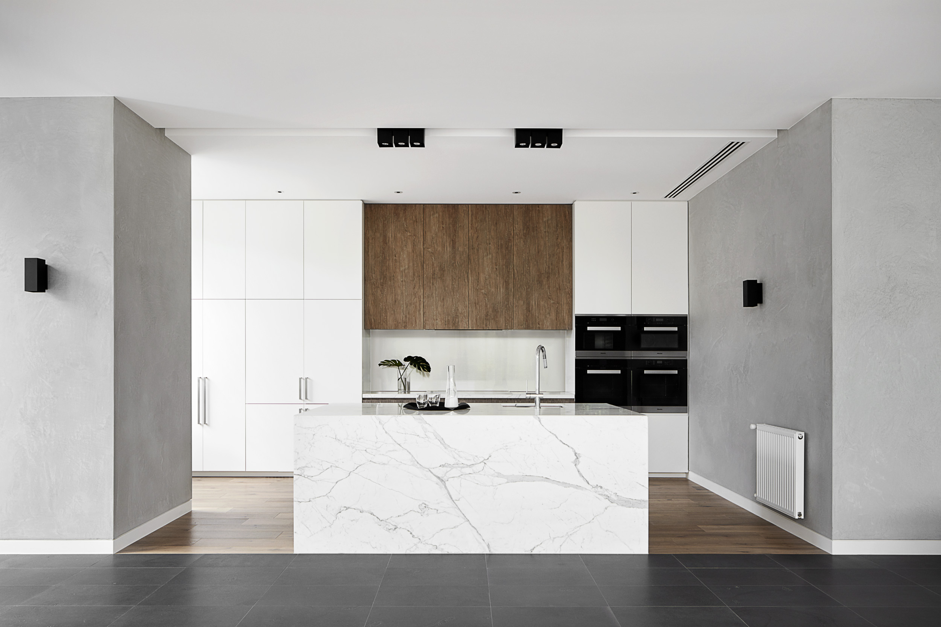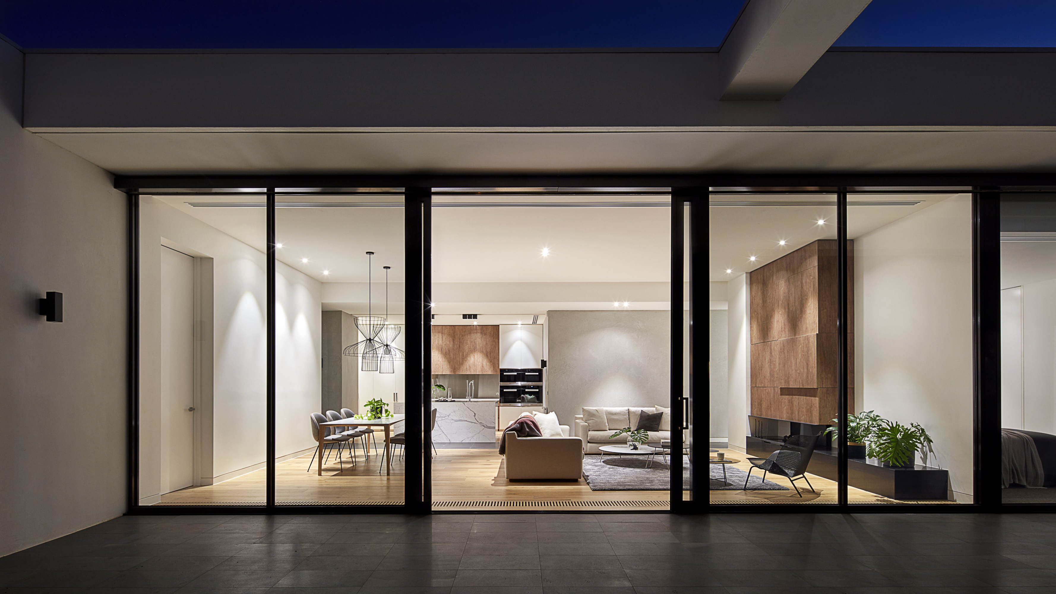 The Balwyn House was designed by Workroom Design and built by us in a 9 month period in 2014. The home spreads across 250m2 over one level and encompasses two bedrooms, two bathrooms, his and hers study, open plan living, dining and kitchen with butlers pantry and two car garage. The idea was to create an easy living, low maintenance single storey house that the retired owners could live in without having to downsize in their twilight years. The material pallet is organic and incorporates teak timber cladding, cement roman render, basalt tiling and Italian marble.